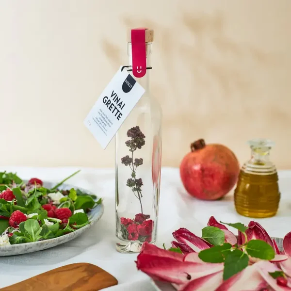 Instructie: Vul het flesje met extra vierge olijfolie, witte wijnazijn en een scheutje honing. Laat het een week staan, zodat de smaken goed kunnen mixen, filteren is niet nodig. Schud de Vinaigrette nog even alvorens te gebruiken.
